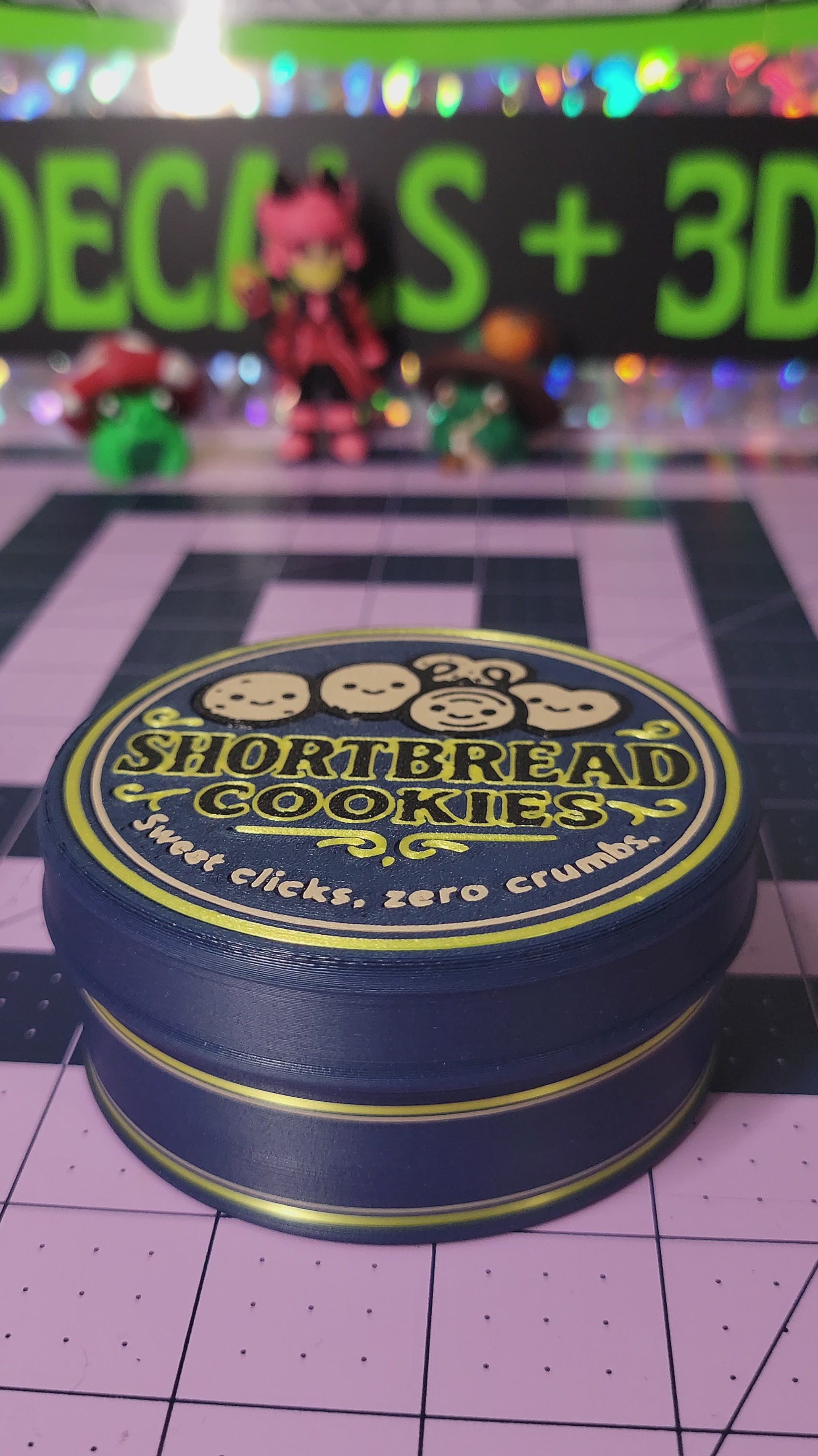 A nostalgic 3D printed clicker fidget inspired by the classic cookie tin that always turned out to be sewing supplies. Inside are familiar sewing themed pieces, each designed to press down with a satisfying click. A comforting, playful fidget that brings a little humor, memory, and stress relief to your day.